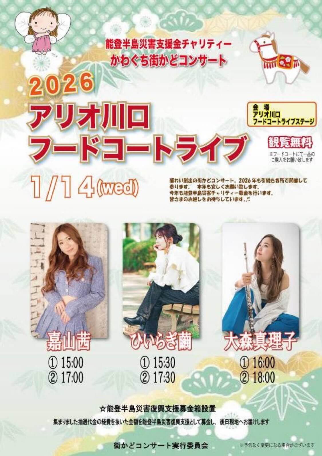 アリオ川口フードコートライブ 2026年1月14(水) 3:00 PM 埼玉 アリオ川口 ◎1月14日(水)夕方 アリオ川口フードコートライブ 【場所】アリオ川口(埼玉) 【時間&出演】 15:00/17:00嘉山茜 15:30/17:30ひいらぎ繭 16:00/18:00大森真理子 初めてのアリオ川口さん!^ ^ 2026年初!川口街かどコンサート出演です⁽⁽ଘ( ˊᵕˋ )ଓ⁾⁾ 平日ではありますが、是非駆けつけて頂けたら嬉しいです!!